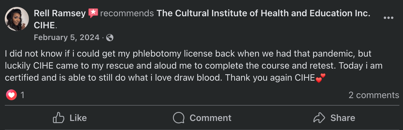 “I did not know if i could get my phlebotomy license back when we had that pandemic, but luckily CIHE came to my rescue and aloud me to complete the course and retest. Today i am certified and is able to still do what i love draw blood. Thank you again CIHE” - Lorell Upchurch