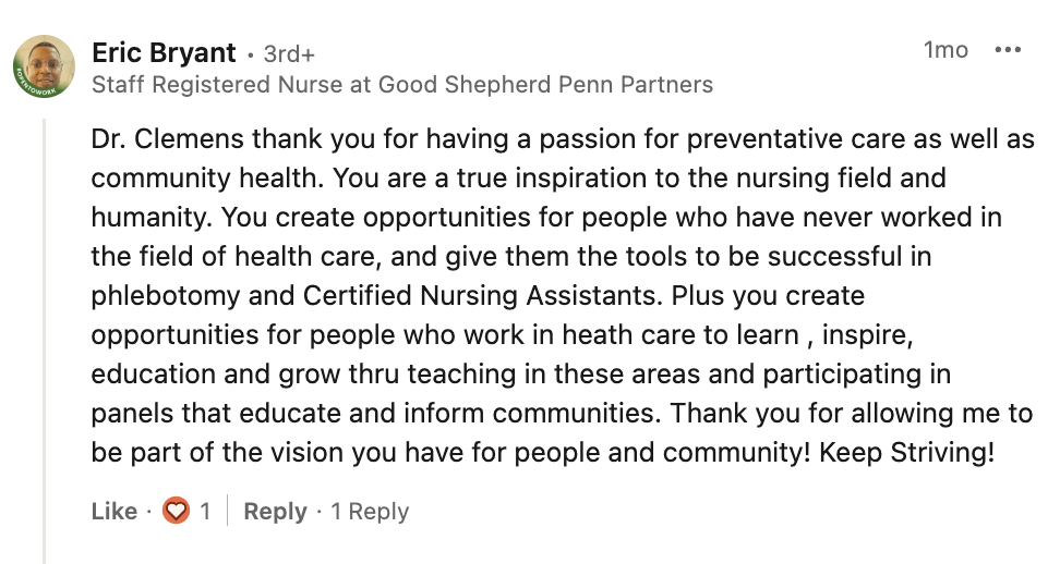 Dr. Clemens’ journey—from earning her first nursing degree at Community College of Philadelphia to receiving her bachelor’s, master’s at Thomas Jefferson, and PhD from Drexel University—reflects her deep commitment to education, mentorship, and community development.